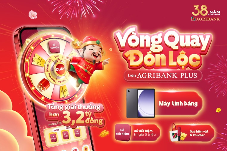 - Nhân dịp chào đón năm mới Xuân Bính Ngọ 2026, từ 20/01/2026 đến 30/03/2026, Agribank triển khai chương trình khuyến mại “Vòng quay đón lộc” trên ứng dụng Agribank Plus nhằm mang đến cho người dùng những trải nghiệm mới cùng nhiều phần quà hấp dẫn khi sử dụng dịch vụ ngân hàng số.